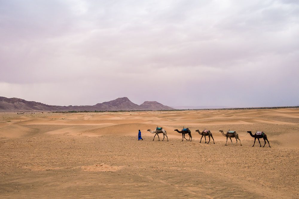Si valica il colle del Tizi n’Tichka (2260 mt) e si arriva alla Kasbah di Aït Ben Haddou; qui si visita il villaggio fortificato (lo Ksar) e si pranza sul posto. Nel pomeriggio, si riparte verso Ouarzazate e si continua per Zagora attraverso l’Anti-Atlante, il villaggio berbero di Agdez e la Valle del Draa, con la sua sequenza di alberi di palma. Arrivati a Zagora, si lascia la jeep e con i dromedari ci si addentra per ammirare il tramonto e passare la notte in tenda. Cena e notte nel bivacco.